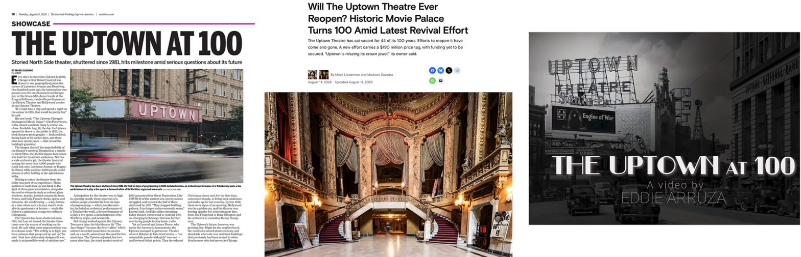 The Uptown: Chicago’s Endangered Movie Palace, the new book by Robert Loerzel and James A. Pierce, is getting attention from TV, radio, podcasts, newspapers, magazines, and websites. Here’s a rundown of the media coverage: WTTW’s Chicago Tonight — Nick Blumberg interviews Loerzel, Pierce, theater owner Jerry Mickelson, and theater caretaker David Syfczak—with new footage filmed inside… Continue reading “The Uptown” Media Coverage